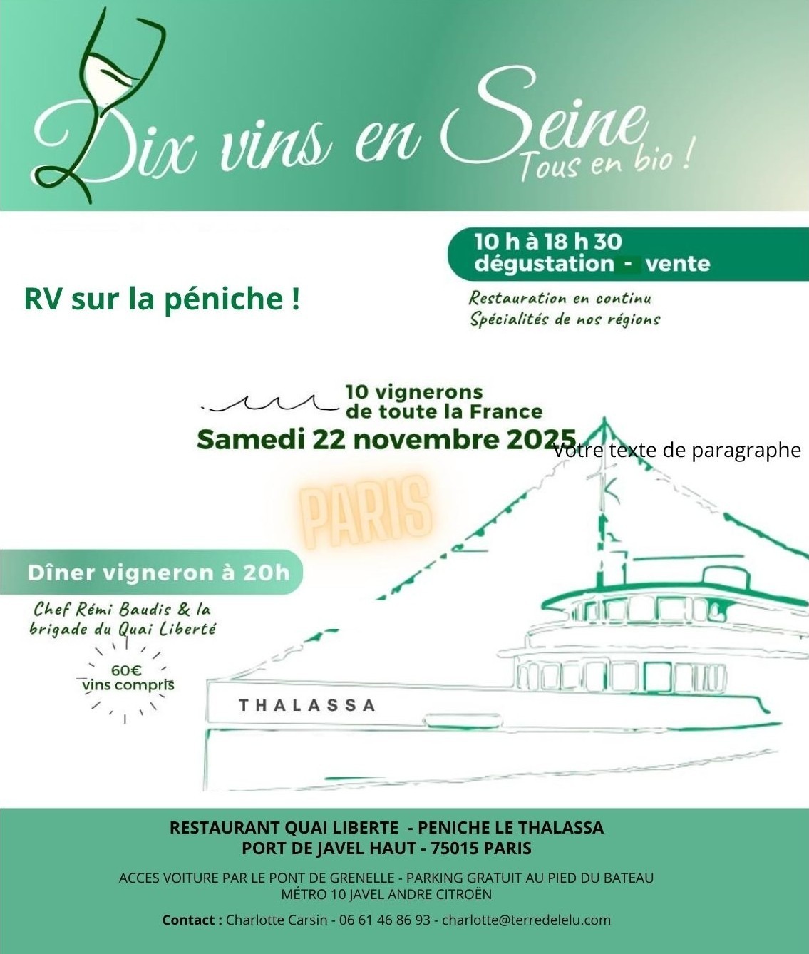 Samedi 22 novembre 2025 : Dix vins en Seine ! Dégustation vente sur la péniche le Thalassa à Paris – Dîner vignerons le samedi soir sur la péniche sur inscription. Clients particuliers